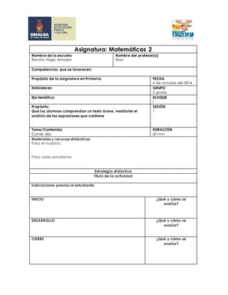 Este documento presenta detalles sobre una lección de matemáticas de grado 2. La lección se llevará a cabo el 6 de octubre de 2014 y se centrará en ayudar a los estudiantes a comprender un texto breve mediante el análisis de expresiones. La lección durará 60 minutos.