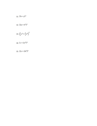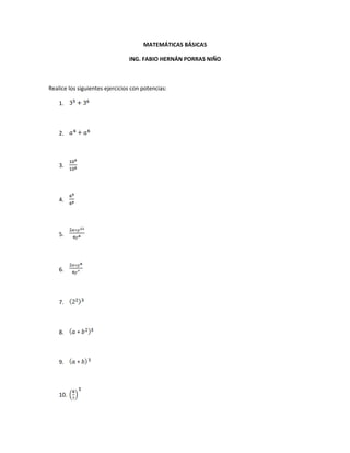 Este documento presenta 15 ejercicios de matemáticas básicas que involucran potencias. Los estudiantes deben resolver cada ejercicio numérico para practicar y dominar conceptos fundamentales como exponenciación.