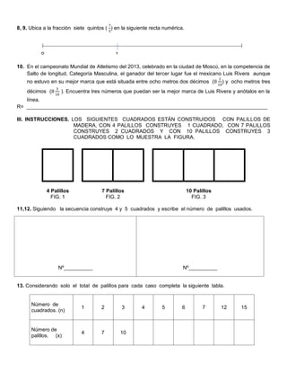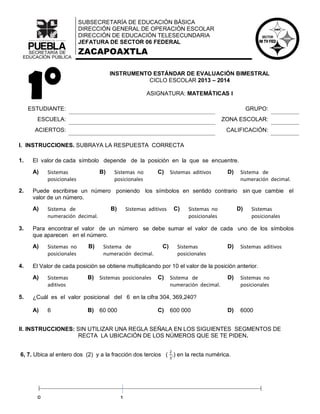 Este documento presenta un examen de matemáticas para estudiantes de telesecundaria. Consiste en 30 preguntas que evalúan conceptos como sistemas de numeración, operaciones con fracciones, construcción de cuadrados con palillos, simetría y problemas de proporcionalidad. El examen pide al estudiante seleccionar respuestas, ubicar números en rectas numéricas, completar tablas y resolver problemas con diferentes pasos.