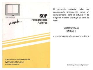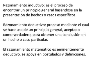 Este documento presenta conceptos básicos de lógica matemática como razonamiento inductivo y deductivo, proposiciones simples y compuestas, conjunción, disyunción, negación, implicación y reglas de inferencia. También introduce silogismos y la estructura básica de una demostración matemática.
