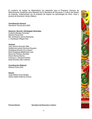 Este documento presenta un cuaderno de trabajo de matemáticas elaborado para mejorar los aprendizajes de niños y jóvenes en Coahuila. Incluye estrategias didácticas para tratar contenidos de difícil comprensión en matemáticas y español en educación inicial, primaria y secundaria. También describe una estrategia de capacitación docente basada en el trabajo en colectivo que busca mejorar los aprendizajes de los maestros y estudiantes.