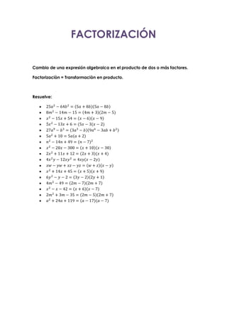 Este documento presenta varios métodos para factorizar expresiones algebraicas, incluyendo factor común, diferencia de cuadrados, agrupación y trinomios cuadrados. También define fracciones complejas y ecuaciones lineales, describiendo los tipos de ecuaciones lineales y métodos como igualación y determinantes para resolver sistemas de ecuaciones lineales.