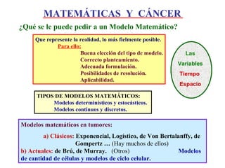 El documento aborda la intersección entre matemáticas y cáncer, destacando la importancia de los modelos matemáticos en la representación y predicción del crecimiento tumoral y la metástasis. Se discuten diferentes tipos de modelos, incluidos determinísticos y estocásticos, así como su aplicabilidad en el tratamiento y la comprensión de la dinámica de las células cancerosas. Además, se enfatiza la necesidad de integrar las matemáticas en la investigación médica para avanzar en el entendimiento del cáncer.