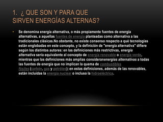 Este documento describe diferentes tipos de energías alternativas y renovables. Explica que las energías alternativas son aquellas que no implican la quema de combustibles fósiles como el carbón, gas y petróleo. Luego enumera y explica brevemente 10 tipos de energías alternativas, incluyendo la energía del agua salada, heliocultivo, piezoelectricidad y conversión de energía termal marina. El objetivo es informar sobre las ventajas del uso de energías limpias y renovables.