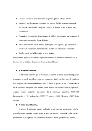 Este documento describe las herramientas multimedia y sus tipos. Define multimedia como cualquier combinación de texto, gráficos, sonido, animación y video presentado por computadora u otros medios electrónicos. Explica que las herramientas multimedia incluyen cámaras digitales, cámaras web, escáneres y proyectores de video. Además, detalla los tipos de información multimedia como texto, gráficos, imágenes, animación, video y sonido. Finalmente, brinda ejemplos de aplicaciones multimedia como educación, publicidad, comercio e inform