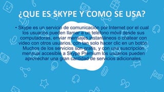 Skype es un software gratuito que permite a los usuarios realizar llamadas de voz y video, así como enviar mensajes de texto a otros usuarios de Skype en cualquier parte del mundo haciendo clic en un botón. Con una suscripción a Skype Premium, los usuarios pueden acceder a más servicios adicionales. Skype fue creado en 2003 por emprendedores daneses y suecos y desarrollado técnicamente por estonios, naciendo originalmente en Tallinn, Estonia.