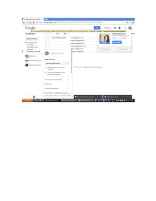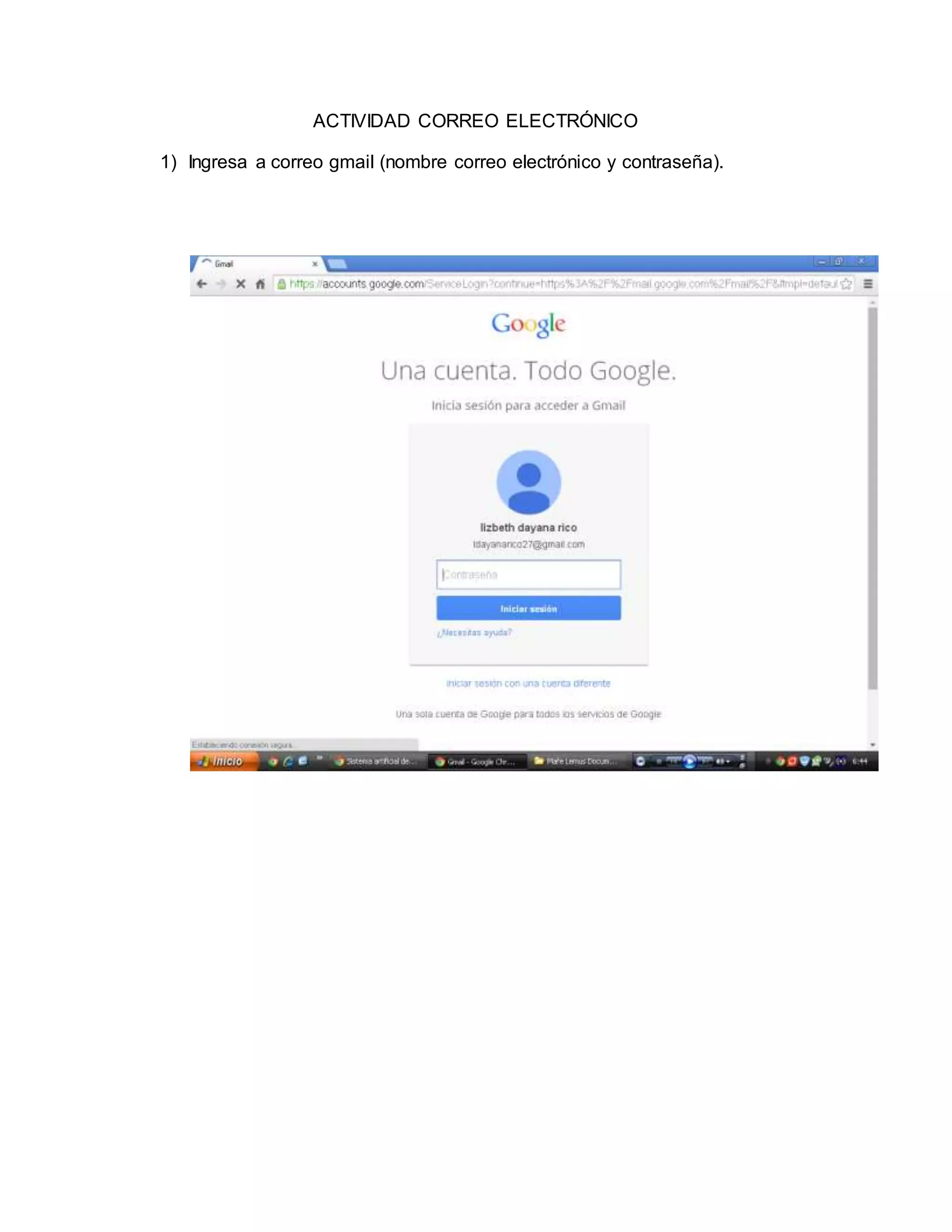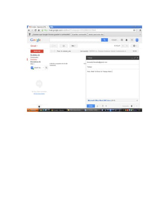El documento describe los pasos para usar una cuenta de correo electrónico de Gmail. Incluye instrucciones para identificar elementos como mensajes recibidos y enviados, crear una firma, agregar contactos y grupos, enviar y recibir mensajes con archivos adjuntos o copias, y personalizar la cuenta cambiando la foto de perfil y el tema del correo.