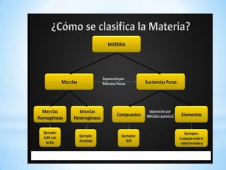El documento proporciona una introducción a la química. Define materia y explica sus características y los tres estados de agregación (sólido, líquido y gaseoso). También describe sustancias puras como elementos y compuestos, y mezclas homogéneas y heterogéneas. Además, explica fenómenos físicos y químicos y las propiedades físicas y químicas de la materia.