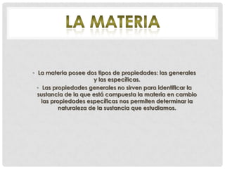 Las propiedades generales de la materia no permiten distinguir entre sustancias, mientras que las propiedades específicas identifican la naturaleza de una sustancia en particular. Algunas propiedades generales incluyen el volumen, la masa, la densidad y la divisibilidad, mientras que las propiedades específicas varían entre sustancias y determinan su identidad química.