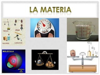 Las propiedades generales de la materia no permiten distinguir entre sustancias, mientras que las propiedades específicas caracterizan cada sustancia de forma única. Las propiedades incluyen volumen, masa, densidad y estado de agregación. La materia puede presentarse como elementos, compuestos, moléculas o mezclas homogéneas y heterogéneas.