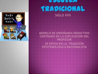 El documento describe un modelo de enseñanza deductivo centrado en la explicación del profesor. Se basa en la tradición racionalista donde el profesor explica conceptos y el alumno escucha y repite la información. El modelo se centra en contenidos organizados por asignaturas y usa métodos conductistas donde el profesor es un ingeniero de conducta y el alumno es un objeto pasivo.
