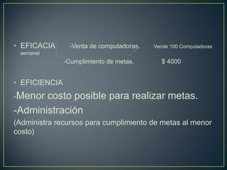 El documento habla sobre la eficiencia y eficacia en la administración. Define la eficacia como cumplir metas como vender 100 computadoras semanales por $4,000. La eficiencia es lograr las metas con el menor costo posible a través de la organización, planificación, control y dirección de los recursos. Para ser eficiente, la administración debe administrar bien los recursos para que cueste poco.
