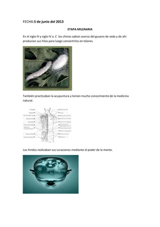 Este documento presenta la historia de la biología desde sus orígenes milenarios hasta la era moderna y biotecnológica. Detalla los principales descubrimientos y figuras clave en cada etapa, incluyendo a Aristóteles, Galeno, Darwin y Watson y Crick. También explica la clasificación de las ciencias biológicas y los niveles de organización de los seres vivos.