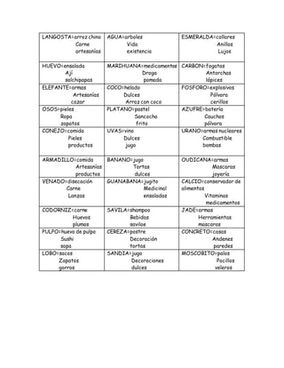 Este documento lista las principales materias primas de origen animal, vegetal y mineral, y algunos de sus usos comunes. Las materias primas de origen animal incluyen vacas (queso, yogurt, mantequilla), gallinas (sancocho, huevos), cerdos (gomitas, lechona, jamón), pescados (sushi, caldo de pescado), abejas (miel, jabones), cacao (chocolate), tiburones (aleta de tiburón), patos (manteca), piñas (batidos, jugos), langostas (ar