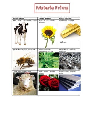 El documento categoriza diversos productos según su origen animal, vegetal o mineral, describiendo sus aplicaciones y beneficios. Cada categoría incluye ejemplos de productos finales, así como propiedades medicinales y usos de las plantas mencionadas. Además, se señala la versatilidad de diferentes materiales, tanto en la alimentación como en la creación de artículos diversos.