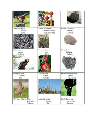 Este documento lista diferentes materias primas de origen animal, vegetal y mineral, y algunos de sus usos comunes. Incluye ejemplos de materias primas de origen animal como la gallina (para sancocho), el cerdo (para chorizo y chicharrón), y la vaca (para leche y carne asada); de origen vegetal como el girasol (para aceite), el árbol (para libros y pisos), y el tomate (para sopa y jugo); y de origen mineral como la plata (para anillos y collares), el oro