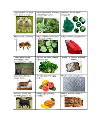 Este documento lista los orígenes animales, vegetales y minerales de varias materias primas, incluyendo productos derivados de la vaca, el girasol, el oro, el pescado, las rosas, la plata, la gallina, la sábila, el petróleo, el cerdo, la hierbabuena, el carbón, la oveja, la marihuana, la esmeralda, las abejas, la ortiga, el rubí, los conejos, la espinaca, el hierro, la cabra, la guayaba, los metal