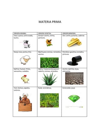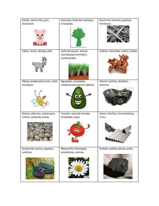 Este documento lista varios materiales de origen animal, vegetal y mineral, y algunos de sus usos comunes. De origen animal se mencionan productos derivados de vacas, ovejas, gallinas, toros, cerdos, cabras, abejas, ostras, serpientes, caracoles, conejos, perros, leones, patos, mariquitas y telas. De origen vegetal se citan el girasol, marihuana, sábila, ruda, espinaca, caña de azúcar, aguacate, tomate, manzanilla, dur