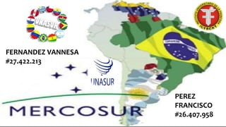 Este documento describe el Mercado Común del Sur (MERCOSUR) como un proceso de integración regional entre Argentina, Brasil, Paraguay y Uruguay, con el objetivo de generar oportunidades comerciales y de inversión a través de la integración de sus economías. Explica que el MERCOSUR toma decisiones a través de tres órganos y más de 300 foros de negociación. También define a la Unión de Naciones Suramericanas (UNASUR) como una organización política y económica entre 12 países suramericanos que busca promover la
