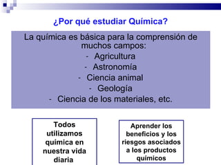El documento introduce los conceptos básicos de la química, incluyendo la clasificación de la materia, los estados físicos, las propiedades, y las unidades de medición. Explica que la química estudia la composición, estructura y transformaciones de la materia. Además, distingue entre cambios físicos y químicos, y describe los diferentes tipos de materia, como elementos, compuestos y mezclas.