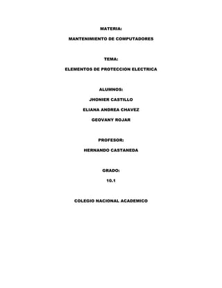 Este documento describe los diferentes elementos de protección eléctrica como breakers, tomacorrientes, estabilizadores, UPS y sistemas de computo. Explica la función de cada uno y cómo trabajan para proteger los equipos eléctricos y mantener un flujo de energía constante.