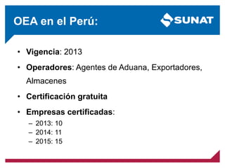 El documento describe el Programa Operador Económico Autorizado (OEA) en Perú. Explica que el programa comenzó en 2013 y actualmente cuenta con 37 empresas certificadas como OEA, incluyendo exportadores, agentes de aduana y almacenes aduaneros. Además, detalla los beneficios y facilidades que reciben las empresas certificadas como OEA, como atención preferencial en trámites aduaneros, menor reconocimiento físico de mercancías y garantías nominales. Finalmente, resalta otros beneficios del programa en los