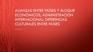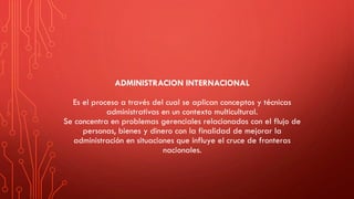 El documento habla sobre la administración internacional y las diferencias culturales entre países. Explica que la administración internacional se refiere a la aplicación de conceptos y técnicas administrativas en un contexto multicultural, centrándose en problemas gerenciales transfronterizos. También describe algunas dimensiones culturales clave estudiadas por Geert Hofstede, como individualismo vs colectivismo, distancia vs cercanía al poder, evitación vs tolerancia a la incertidumbre, masculinidad vs feminidad, y orientación a corto vs largo plazo