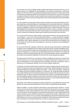 Este documento presenta una introducción a un dossier dedicado a explorar las transformaciones recientes en las identidades docentes. Explica que los docentes enfrentan incertidumbre debido a cambios sociales y culturales que cuestionan las certezas que guiaron su trabajo por más de un siglo. El dossier incluye artículos que analizan cómo los docentes son interpelados por nuevos mecanismos de regulación y cómo significan este nuevo escenario.