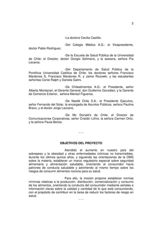 Este documento presenta los antecedentes y objetivos de un proyecto de ley chileno sobre la composición nutricional de los alimentos y su publicidad. Resalta el aumento de enfermedades crónicas como la obesidad y propone regular la información nutricional y publicidad de alimentos para orientar al consumidor hacia opciones más saludables. Expertos discuten cómo abordar factores de riesgo como el alto consumo de sal, grasas y azúcares. El proyecto busca establecer normas claras sobre la producción, distribución, com