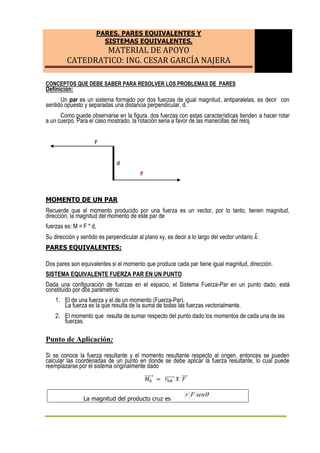 Este documento presenta conceptos sobre pares, pares equivalentes y sistemas equivalentes. Define un par como dos fuerzas iguales y opuestas separadas por una distancia perpendicular. Explica que el momento de un par es igual a la fuerza por la distancia. Además, resuelve tres problemas que implican determinar sistemas equivalentes fuerza-par reemplazando configuraciones de fuerzas.