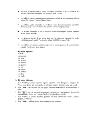 Este documento proporciona reglas sobre el uso de la tilde en palabras españolas. Explica que las palabras que terminan en "mente" conservan su acento, y que el primer elemento de una palabra compuesta no lleva acento. También cubre reglas para diptongos, triptongos, hiatos, mayúsculas, y el uso de la h. En resumen, ofrece una guía detallada sobre la acentuación ortográfica en español.