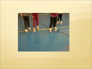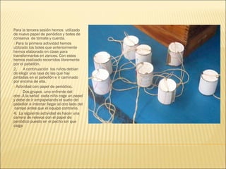 El documento describe 4 actividades realizadas en una sesión. La primera actividad involucró el uso de botes de conserva de tomate como zancos. La segunda actividad requirió que los niños caminaran sobre líneas pintadas. La tercera actividad fue una competencia entre dos grupos para empapelar el suelo con papel de periódico. La cuarta actividad fue una carrera de relevos sosteniendo papel de periódico en el pecho.
