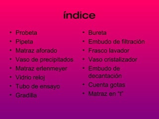 El documento describe y define brevemente diversos materiales y herramientas de laboratorio comúnmente utilizados, incluyendo probetas, pipetas, matraces aforados, vasos de precipitados, matraces Erlenmeyer, vidrios de reloj, tubos de ensayo, gradillas, buretas, embudos de filtración, frascos lavadores, vasos cristalizadores, cuentas gotas, embudos de decantación y matraces en "T".