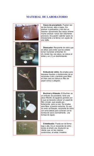 El laboratorio está equipado con una variedad de materiales de vidrio y otros materiales necesarios para llevar a cabo experimentos científicos de manera controlada y repetible. Entre los materiales de vidrio se incluyen vasos de precipitado, buretas, pipetas, probetas, matraces Erlenmeyer, condensadores y tubos de ensayo. Otros materiales como mecheros, balanzas, soportes y morteros de porcelana también se proporcionan.