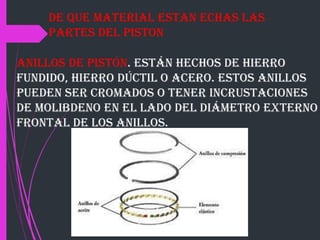Las partes principales del pistón incluyen los anillos de pistón, las faldas, el pin y el seguro de pin. Los anillos de pistón y las faldas se fabrican típicamente de hierro fundido, hierro dúctil o acero. El pin y el seguro de pin se hacen de aleaciones de acero o aluminio. Los brazos de biela, las tapas de biela y los cojinetes suelen estar hechos de aceros como el AISI 4340 o aleaciones a base de acero, titanio o aluminio.