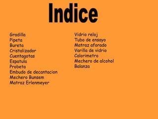 El documento describe diferentes instrumentos de laboratorio, incluyendo gradillas, pipetas, buretas, cristalizadores, cuentagotas, espátulas, probetas, embudos de decantación, mecheros Bunsen, matraces Erlenmeyer, vidrios de reloj, tubos de ensayo, matraces aforados, varillas de vidrio, calorímetros, mecheros de alcohol y balanzas, y explica sus usos respectivos en el laboratorio.