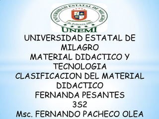 El documento clasifica y describe diferentes tipos de materiales didácticos, incluyendo materiales impresos, gráficos, audiovisuales y de nuevas tecnologías. Explica que los materiales didácticos pueden usarse dentro o fuera del aula para apoyar una variedad de objetivos educativos. También enfatiza la importancia de seleccionar y evaluar los materiales didácticos para mejorar los procesos de enseñanza y aprendizaje.