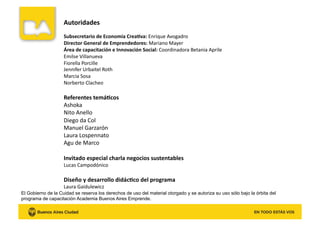Este documento presenta la segunda edición del programa "Academia Buenos Aires Emprende", dirigido a emprendedores en etapas iniciales. El programa busca desarrollar competencias críticas para construir emprendimientos e incorporar herramientas para generar ideas innovadoras. A lo largo de 8 encuentros, los participantes aprenderán sobre temas como oportunidades de negocio, modelo de negocio y pitching, entre otros. El objetivo es potenciar la red de emprendedores para que generen proyectos de alto impacto social y económico de manera