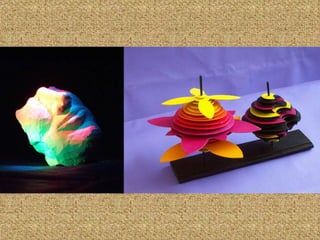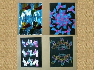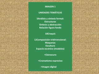 El documento presenta materiales y unidades temáticas discutidas en un encuentro de profesores sobre análisis y síntesis formal en el arte. Se abordan conceptos como la relación figura-fondo, diversas técnicas plásticas, y el estudio de la figura humana en diferentes corrientes estéticas. También se incluye la experimentación con materiales y la reinterpretación de obras de grandes maestros.