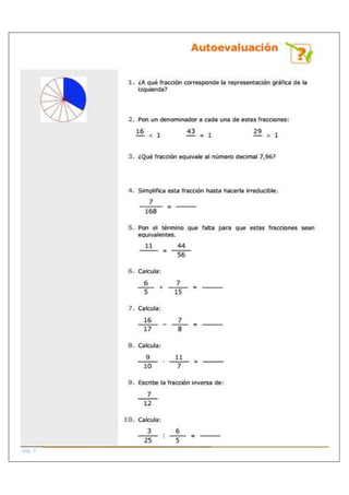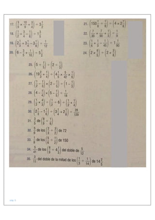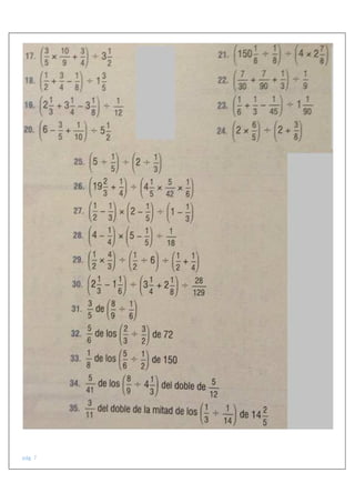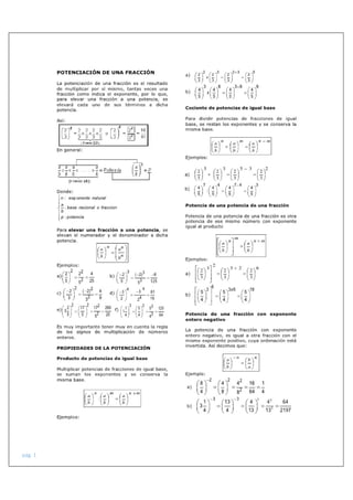 Este documento presenta diferentes temas relacionados con operaciones con fracciones, incluyendo potenciación y radicación de fracciones, operaciones combinadas con fracciones, y operaciones con fracciones complejas.