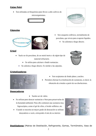 Este documento describe los materiales básicos de un laboratorio de química, incluyendo utensilios como matraces, balanzas, buretas, pipetas, mecheros y más. Explica brevemente las propiedades y usos de cada elemento, como las balanzas para medir masas, los matraces para realizar reacciones, y los mecheros para proporcionar calor. En total, el documento proporciona una introducción concisa a los instrumentos y equipos fundamentales encontrados en un laboratorio químico típico.