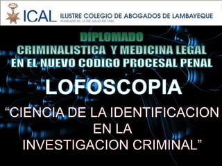 Este documento describe los conceptos básicos de la lofoscopia o papiloscopia y su aplicación en la investigación criminal. Explica que la lofoscopia es una de las pruebas más eficaces para identificar a personas vinculadas a un hecho delictivo. También describe los diferentes sistemas utilizados, como el AFIS, y el valor probatorio de la lofoscopia en el nuevo código procesal peruano.