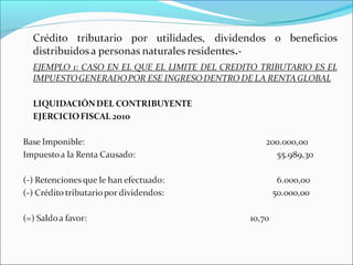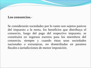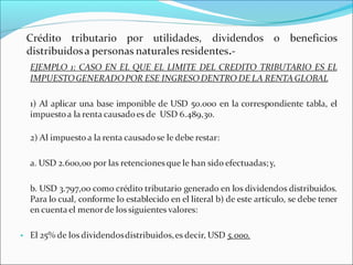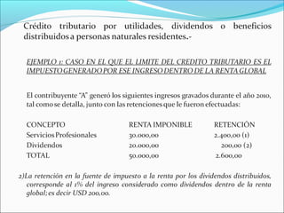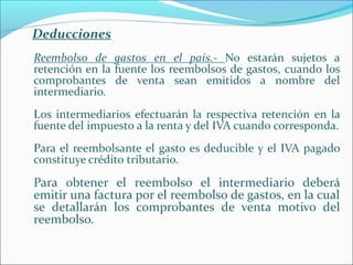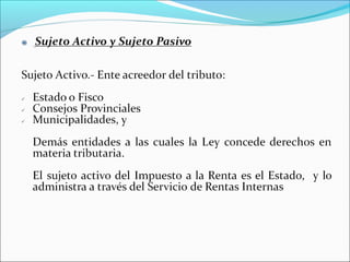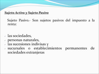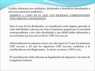 El documento describe el Registro Único de Contribuyentes (RUC) en Ecuador, que es el número de identificación para personas y entidades sujetas a obligaciones tributarias. Explica la estructura del RUC y los diferentes tipos para personas naturales, sociedades privadas y públicas, y extranjeros. También cubre los requisitos para la inscripción, actualización de datos, estados posibles del RUC, y los diferentes tipos de comprobantes de venta y retención reconocidos para sustentar créditos tributarios y costos.