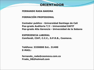 Este documento presenta el perfil profesional de Fernando Rada Barona, experto en auditoría de control interno. Detalla su formación académica y experiencia laboral en diferentes empresas. Además, introduce conceptos clave sobre control interno como su definición, objetivos, componentes, tipos de controles y actividades de control.