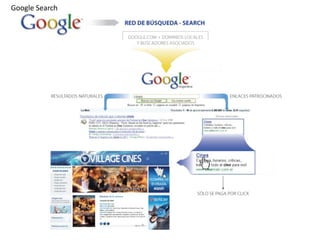 Este documento proporciona información sobre diferentes medios publicitarios digitales como Google, Facebook y YouTube. También incluye ejemplos de justificaciones, métricas y formatos para cada medio, así como una explicación sobre el seguimiento de redes sociales, publicidad móvil y el concepto de "long tail".