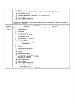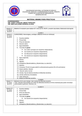 Este documento detalla el plan de estudios y material requerido para 6 clases de capacitación en primeros auxilios impartidas a estudiantes de la Universidad Nacional Autónoma de México. Incluye una lista del equipo mínimo necesario para cada clase práctica, como guantes, pinzas, soluciones, gasas, vendas y más. También divide a los estudiantes en dos grupos para rotar entre prácticas de canalizaciones venosas y otras actividades.