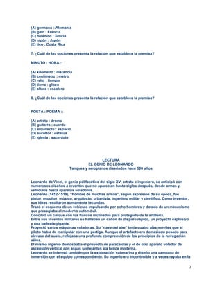 El documento presenta una serie de ejercicios de razonamiento verbal. En el primer ejercicio, el lector debe indicar si las oraciones presentadas contienen el uso correcto o incorrecto de palabras subrayadas. En el segundo ejercicio, similar al primero, el lector debe identificar el uso correcto e incorrecto de palabras subrayadas en varias oraciones. Finalmente, el documento presenta dos lecturas sobre Leonardo da Vinci e inventos y sobre la civilización maya, respectivamente, para contextualizar los ejercicios de razonamiento verbal.