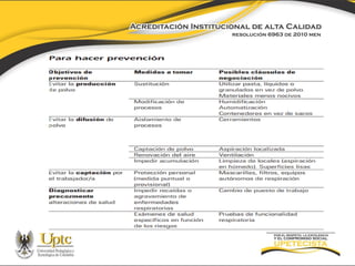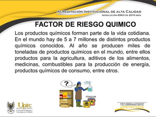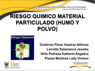 Este documento describe los riesgos químicos y material particulado (humo y polvo) en el lugar de trabajo. Explica cómo estos contaminantes pueden ingresar al cuerpo y causar daños a la salud, incluyendo enfermedades pulmonares como neumoconiosis. También cubre la selección adecuada de equipos de protección respiratoria para minimizar los riesgos de exposición ocupacional.