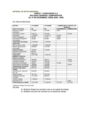 El documento presenta el balance general comparativo de la empresa Medina y Asociados C.A. para los años 2009 y 2008. Muestra un incremento en el activo total de la empresa de 6.502.960 mil bolívares en 2009 frente a 6.299.496 mil bolívares en 2008. El capital de trabajo también aumentó, pasando de 4.481.780 mil bolívares en 2009 a 4.393.668 mil bolívares en 2008.