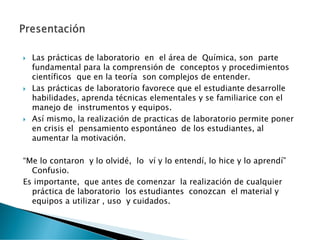 Las prácticas de laboratorio en química son fundamentales para comprender conceptos complejos. Permiten que los estudiantes desarrollen habilidades prácticas y se familiaricen con el equipo de laboratorio. Además, al realizar experimentos, los estudiantes pueden cuestionar sus propias ideas y motivar su aprendizaje. El documento luego describe varios instrumentos y equipos de laboratorio comúnmente usados, incluyendo matraces, tubos de ensayo, balanzas y quemadores.